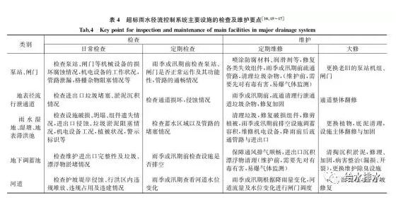 超标雨水径流控制系统是由地面或地下调蓄、排放设施组成的蓄排系统,用以应对超过源头径流减排系统和城市排水管渠系统承载能力的降雨径流导致的城市积水灾害,也称为大排水系统。工业水处理设备技术设施包括排涝泵站、末端滞洪池、调蓄隧道、地表径流行泄通道、大型湿地坑塘以及城市内河等。其检查和维护的要点不同于源头减排系统和排水管渠系统,应更为注重平时的日常巡视以及降雨前、降雨过程中和降雨后的系统调度管控。表4列举了超标雨水径流控制系统主要设施的检查和维护要点。