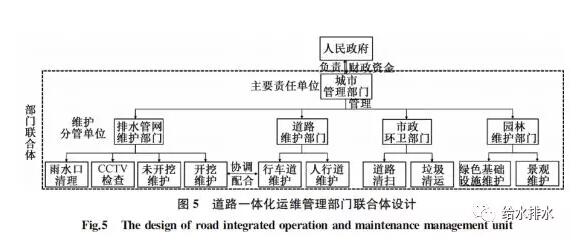 成立部门联合体有利于加强分管部门之间的沟通联系,提高维护效率;同时分管单位间相互监督,相互制约,配合绩效考评的方式分配维护资金,避免了权利失衡,主要负责单位可向违反维护要求的个人及单位(如向雨水口倾倒污水)行使行政处罚权利,以此保障城市雨水系统的健康发展。以道路项目的维护管理为例,在不打破原有管理体制的情况下,可建立以城市管理部门为责任单位,排水管网维护部门,道路维护部门,市政环卫部门,园林维护部门等多部门合作的部门联合体,详见图5。