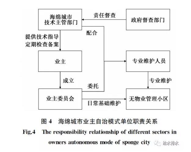 业主自治模式主要针对海绵城市建设中无物业管理小区的改造项目,鼓励业主自行成立业主委员会,自筹资金负责小区内雨水设施的维护管理工作,如日常的设施垃圾清理、植被修剪等。同时坚持“公众自治”与“政府指导”同步的原则,海绵城市技术主管部门负责定期对业主进行技术指导及培训,对于超出业主自身维护能力范围的问题,如管网的清掏与修复,技术主管部门负责配合业主委员会委托专业维护人员进行维护工作,同时政府督查部门负责对主管部门进行督查,规范其履行政府职能,使维护管理工作实现从依靠政府维持到“自治共管”的转变,如图4所示。